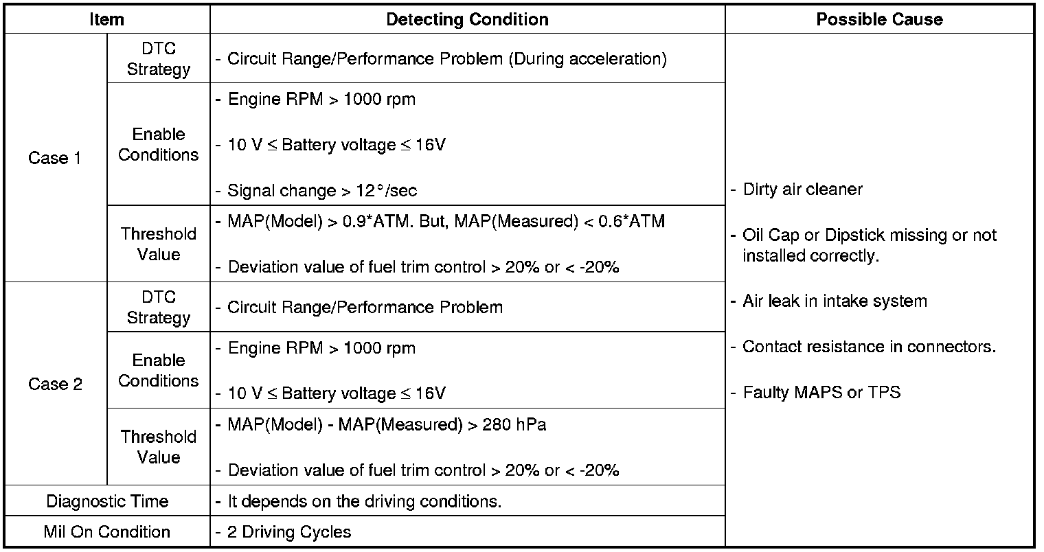 PCM compares the MAPS output and calculated MAPS value while enable condition is met. If the actual MAP value is higher than Maximum threshold or lower than Minimum threshold for a pre-determined time, PCM determines that a fault exists and a DTC is stored.