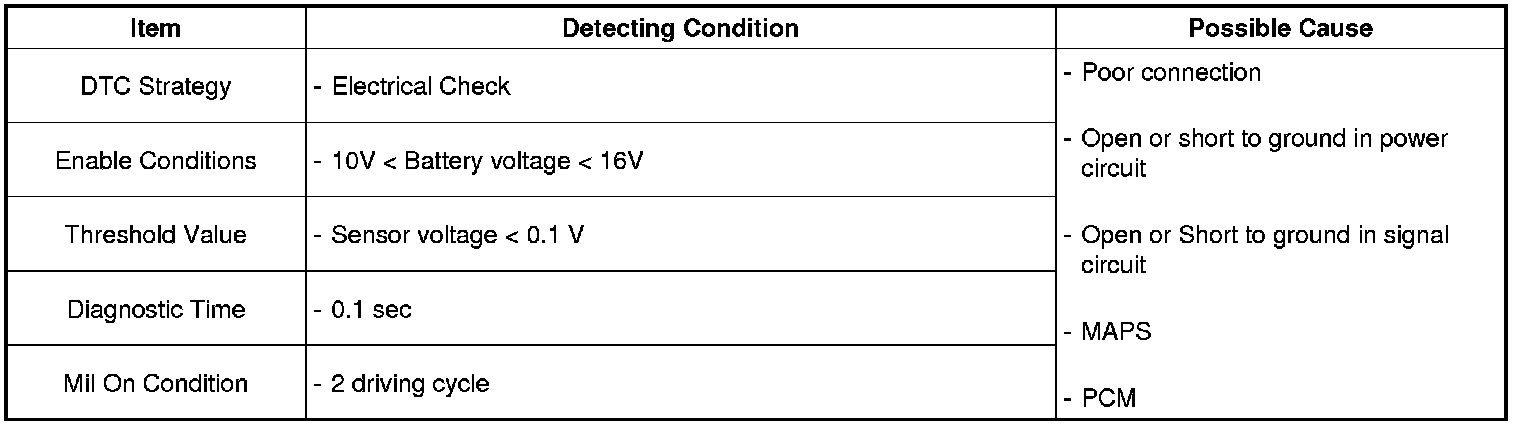 If sensor signal input is lower than 0.1 V during 0.1 sec, PCM sets DTC P0107.