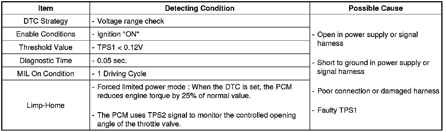 PCM sets DTC P0122 if the PCM detects signal voltage lower than the possible range of a properly operating TPS 1.