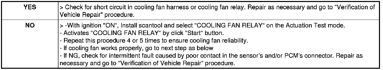 5. Are the cooling fans running when engine coolant temperature is low (less than approximately 98°C (208°F)) with A/C OFF?