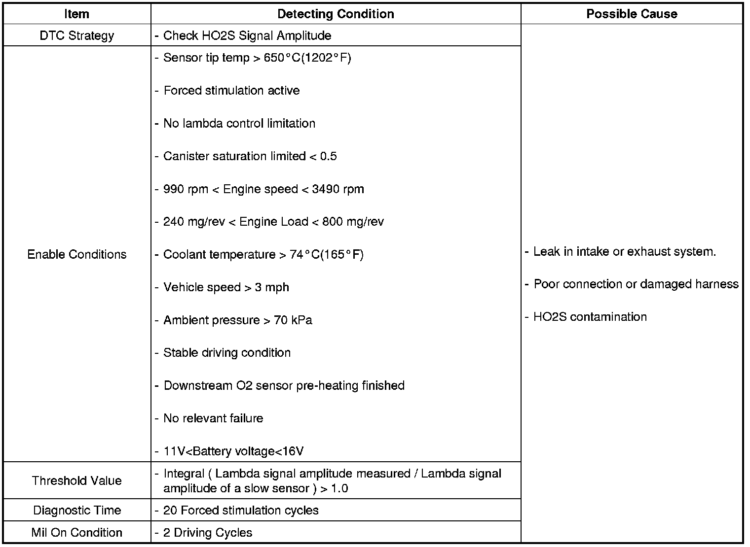 The PCM monitors front oxygen sensor amplitude level and compares it to predetermined minimum amplitude value which could increase emission or disturb lambda control by the effect of aging on the oxygen sensor. The PCM sets DTC P0133 when the amplitude of oxygen sensor is equal to or less than minimum amplitude threshold.