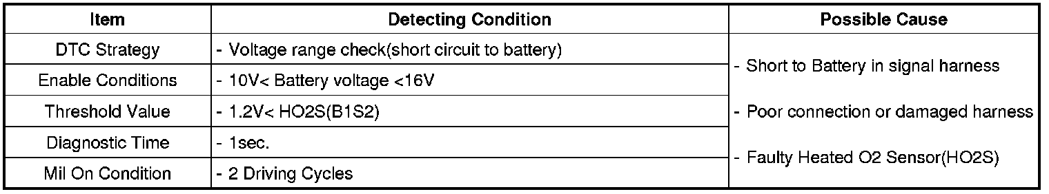 PCM sets DTC P0138 if the HO2S (B1S2) voltage remains excessively high for a predetermined time.