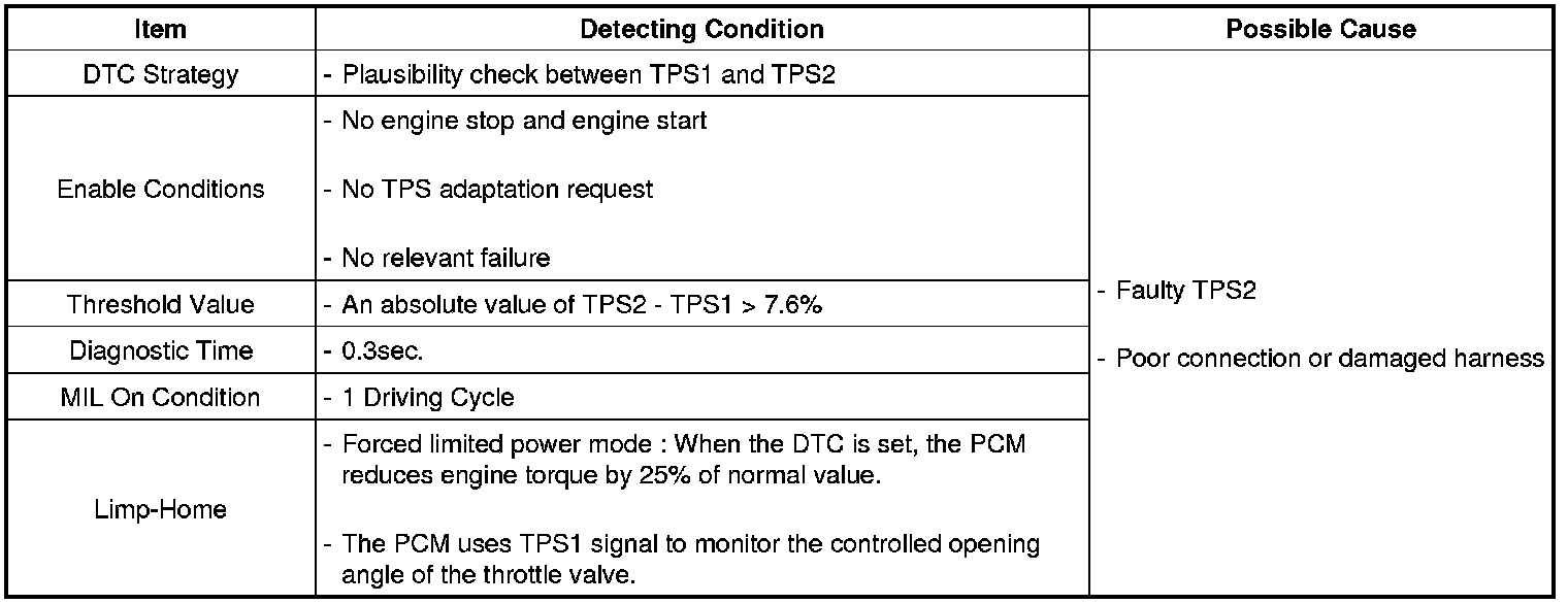 The Electronic Throttle Control (ETC) system is made of the components throttle body, Throttle Position Sensor (TPS)1&2 and Accelerator Position Sensor (APS) 1&2. TPS 1&2 are sharing the same source voltage and ground. The throttle valve opening is control by throttle motor which is controlled by Engine Control Module (PCM). The opposite position indicator shows inverted signal characteristics. TPS 1 output voltage increases smoothly in proportion with the throttle valve opening angle after starting. TPS 2 output voltage decreases in inverse proportion with the throttle valve opening angle after starting. TPS provides feedback to the PCM to control the throttle motor in order to control the throttle valve opening angle properly in response to the driving condition.
