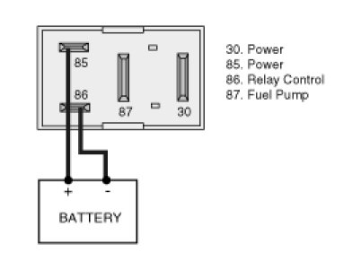 3. Apply 12 V and a ground to 85 and 86 terminals of the fuel pump relay (Components side).