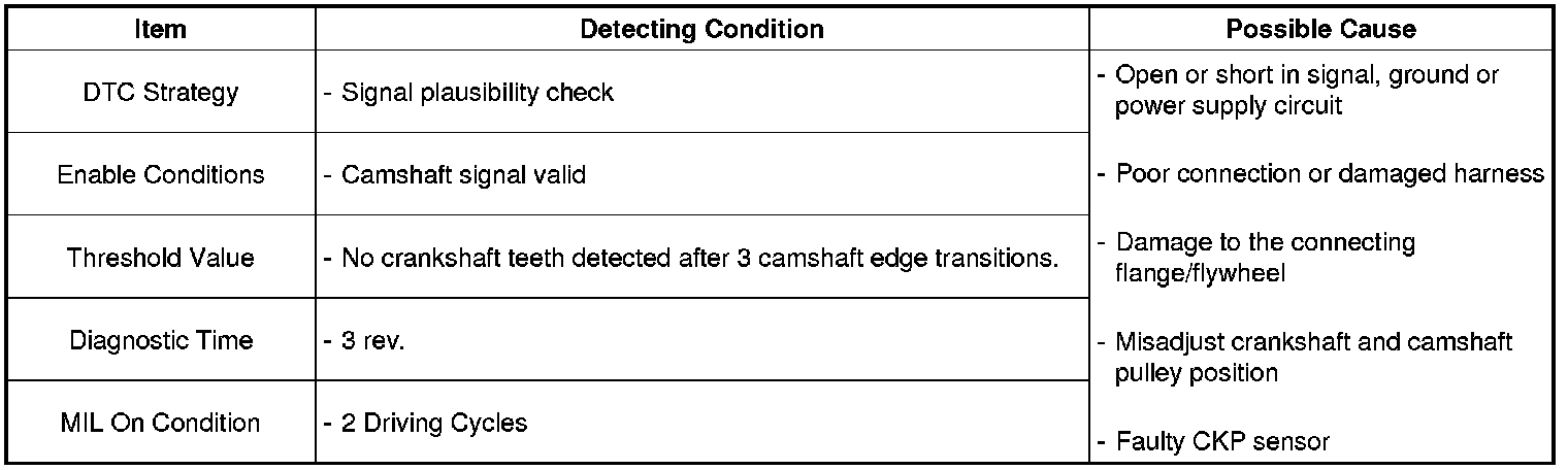 The PCM sets DTC P0335 when the number of crankshaft teeth during one revolution is incorrect or crankshaft signal is missing while camshaft signal is detected.