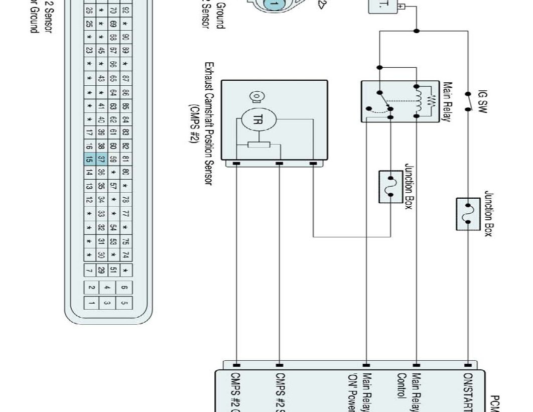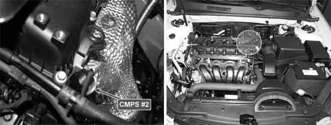 The Camshaft Position Sensor (CMPS) is a sensor that detects the compression TDC of the NO. 1 cylinder. The CMPS consists of a hall type sensor and a target on the end of the intake camshaft. When the target triggers the sensor, the sensor voltage is 5 V. If not, the sensor voltage is 0 V. These CMPS signal is sent to the PCM and the PCM uses the CMPS signal for synchronizing the firing of sequential fuel injectors.
