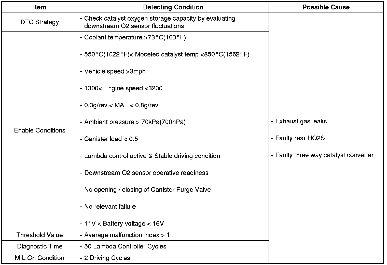 The PCM calculates oscillation size of rear HO2S signal which represents catalyst conversion properties. This oscillation size will determine if catalyst conversion is low due to aging or poisoning from leaded fuel or misfiring. The PCM sets P0420 if the average of calculated oscillation size of rear HO2S signal during predetermined duration is higher than the predetermined threshold.
