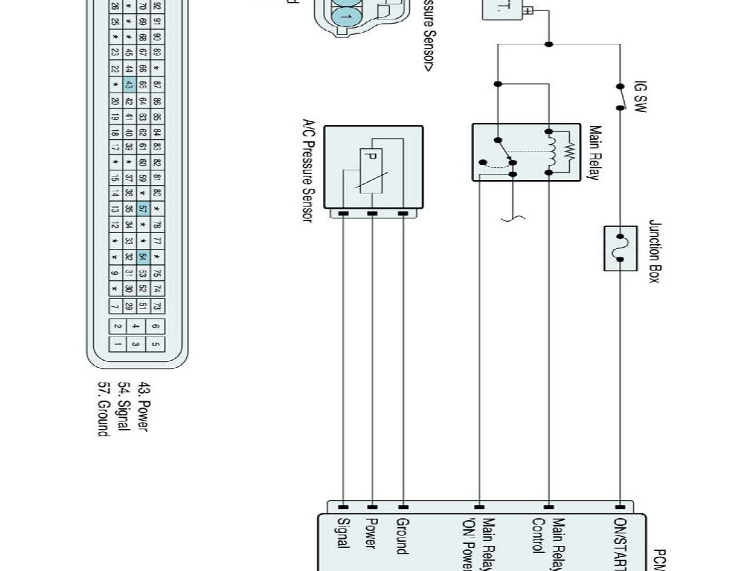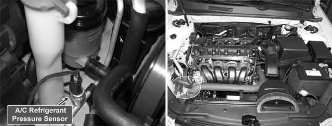 The PCM (Engine Control Module) receives pressure signal in the A/C refrigerant high pressure side from the A/C refrigerant pressure sensor. This input indicates how much load the A/C compressor is putting on the engine and is one of the factors used by the PCM in order to determine the idle air control position for the idle speed. The circuits consist of a 5 V reference and a ground, both provided by the PCM, and a signal from the sensor. The signal is a voltage which is proportional to the A/C pressure from 0 to 5 V. Low pressure produces a low voltage signal and high pressure a high-voltage signal.
