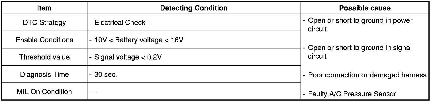 PCM sets DTC P0532 if the PCM detects signal lower than the possible range of a properly operating sensor.