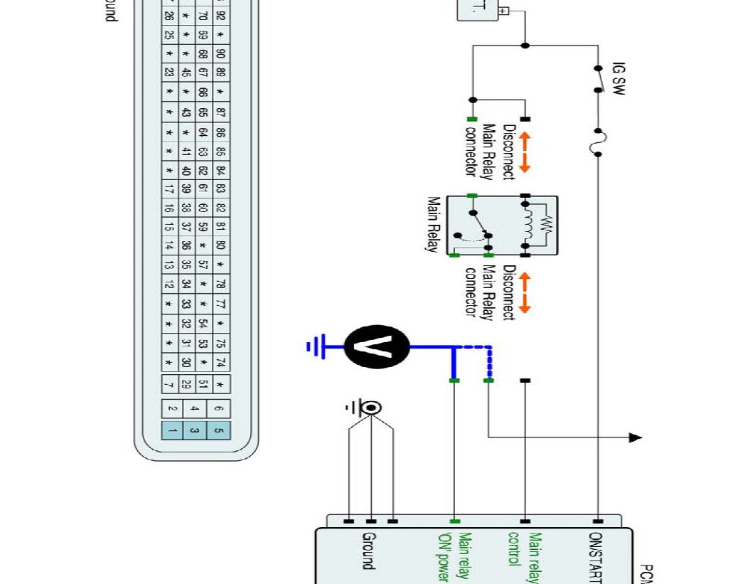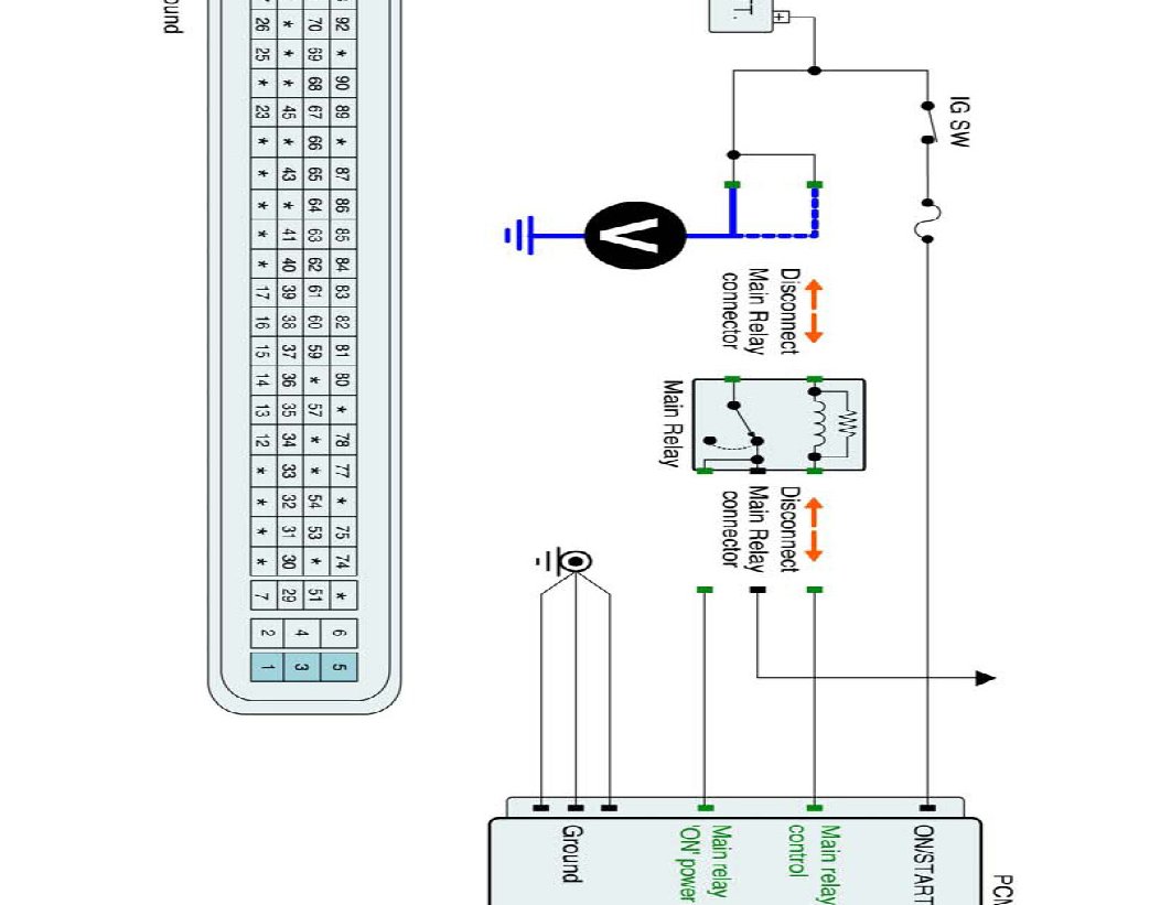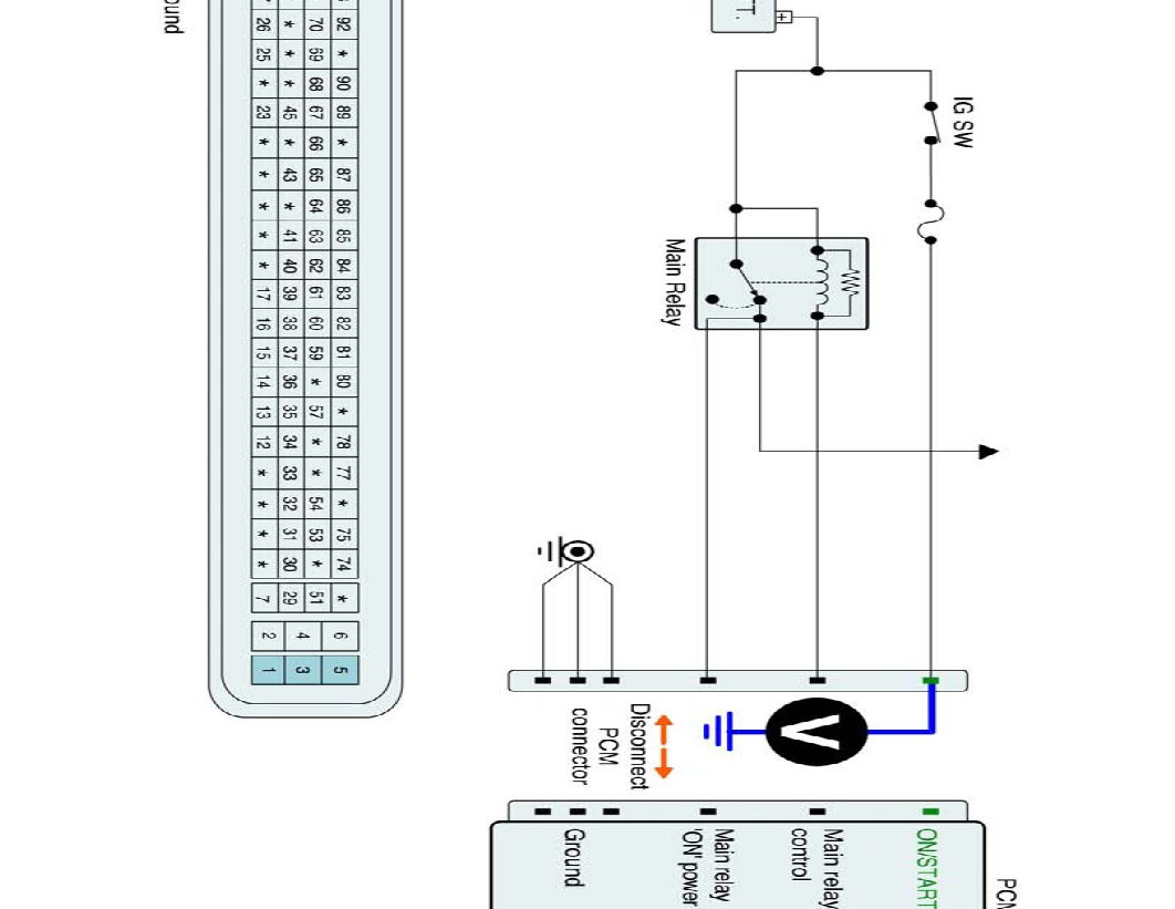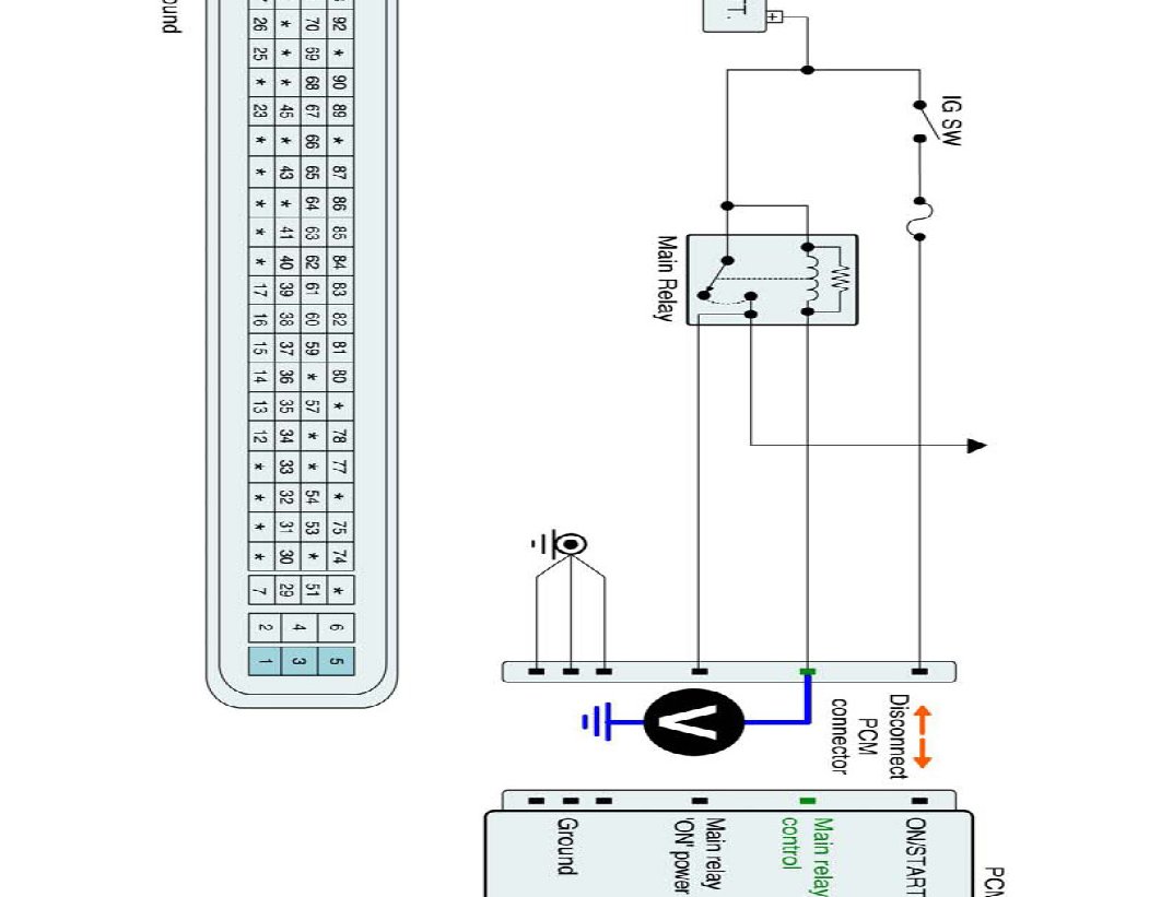 2. With PCM connector disconnected, measure voltage between main relay control terminal of the PCM harness connector and chassis ground.