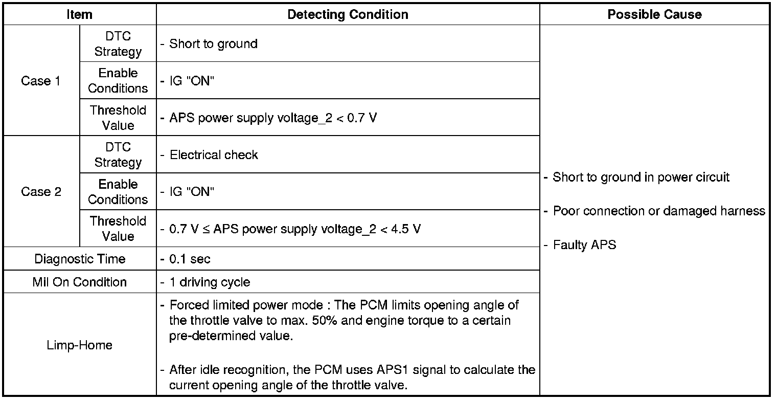 The PCM provides a 5volt reference voltage to the Acceleration Position Sensor 1 (APS 2). The PCM monitors reference voltage deviation from the power supply circuit of the APS 2.