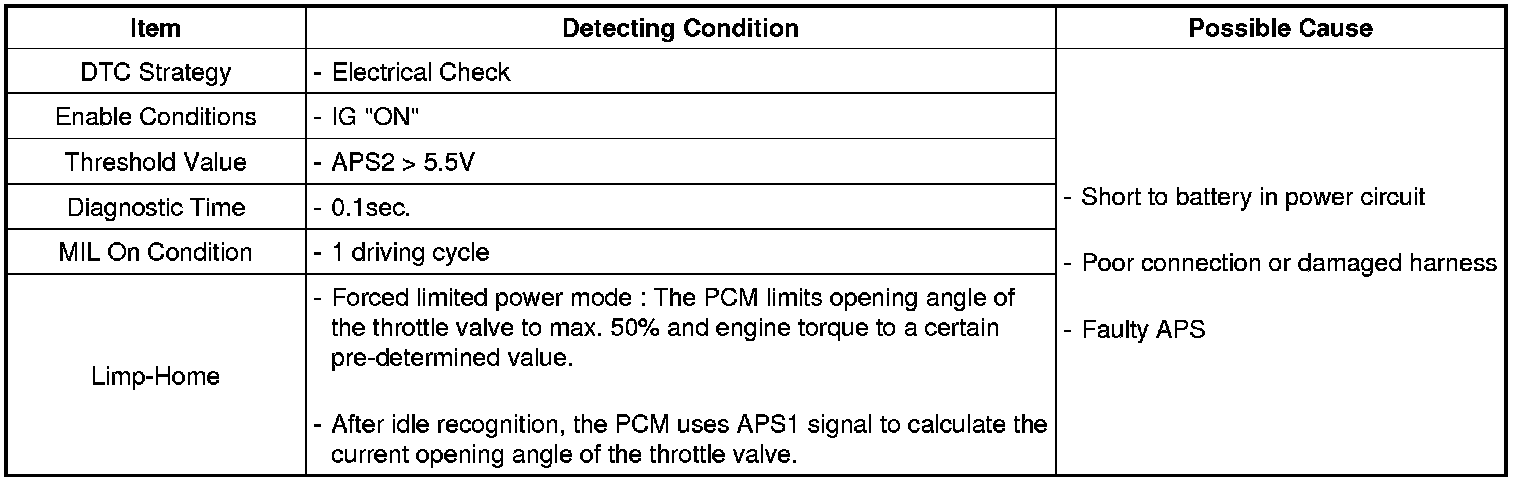 The PCM provides a 5volt reference voltage to the Acceleration Position Sensor 1 (APS 2). The PCM monitors reference voltage deviation from the power supply circuit of the APS 2.