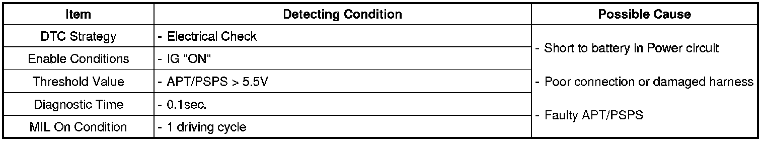 PCM sets DTC P06A5 if the PCM detects reference voltage of APT and PSPS are Higher than threshold value.