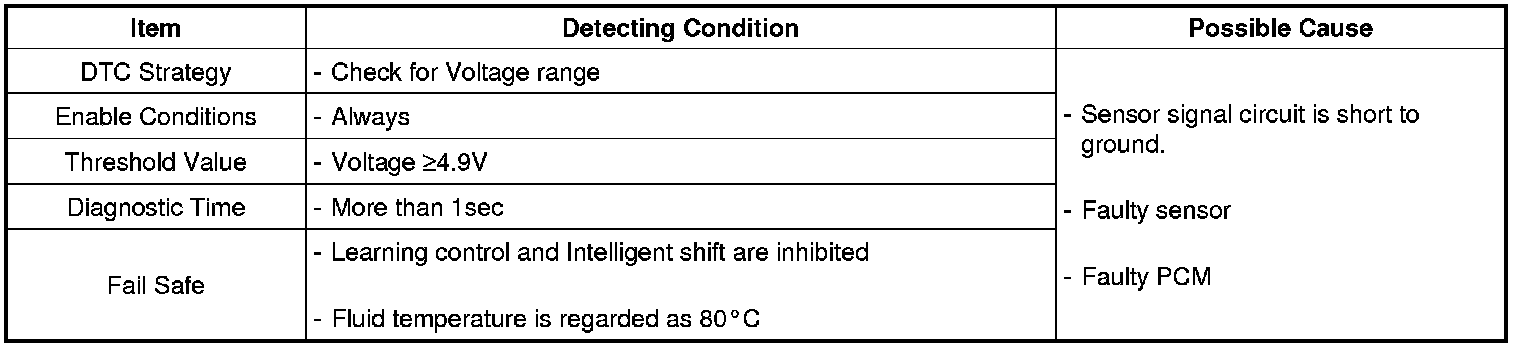 This DTC code is set when the ATF temperature output voltage is higher than a value generated by thermistor resistance, in a normal operating range, for an extended period of time. The TCM regards the ATF temperature as fixed at a value of 80 °C.
