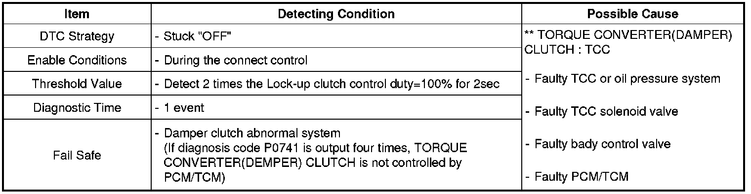 The PCM/TCM increases the duty ratio to engage the Damper Clutch by monitoring slip rpms (difference value between engine speed and turbine speed). To decrease the slip of the Damper Clutch, the PCM/TCM increases the duty ratio by applying more hydraulic pressure. When slip rpm does not drop under some value with 100% duty ratio, the PCM/TCM determines that the Torque Converter Clutch is stuck OFF and sets this code.