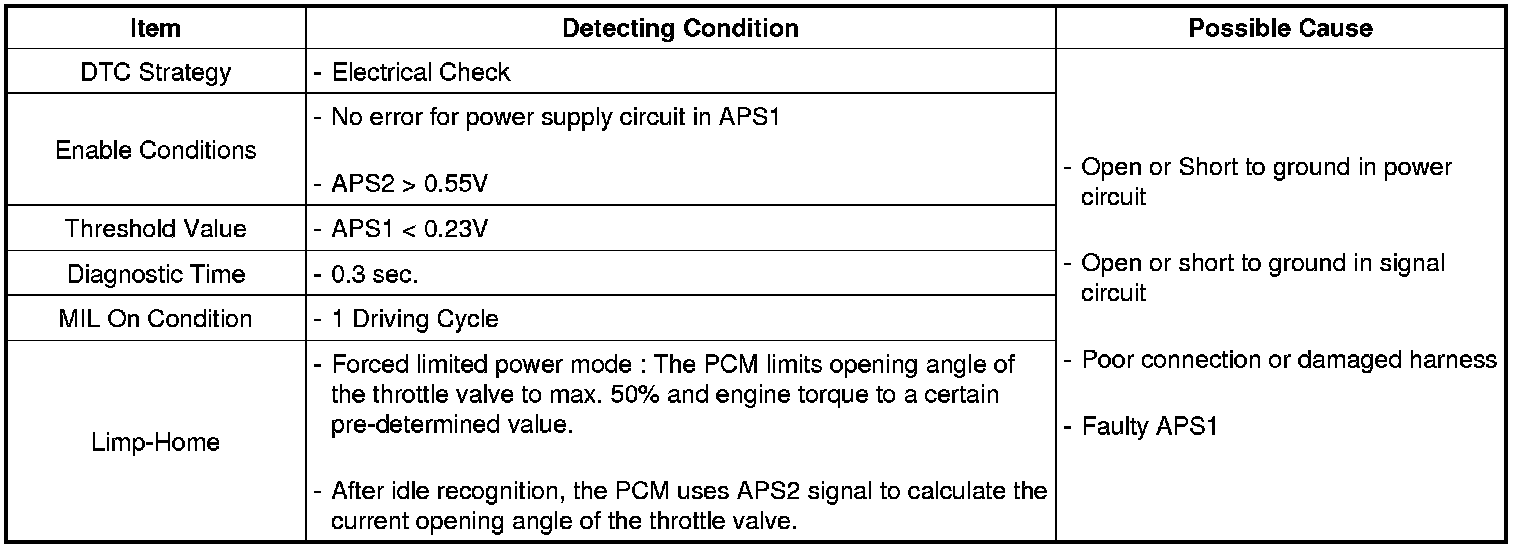 PCM sets DTC P2122 if the PCM detects output voltage lower than the possible range of a properly operating APS 1.