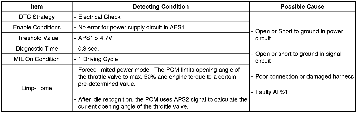 PCM sets DTC P2123 if the PCM detects output voltage higher than the possible range of a properly operating APS 1.