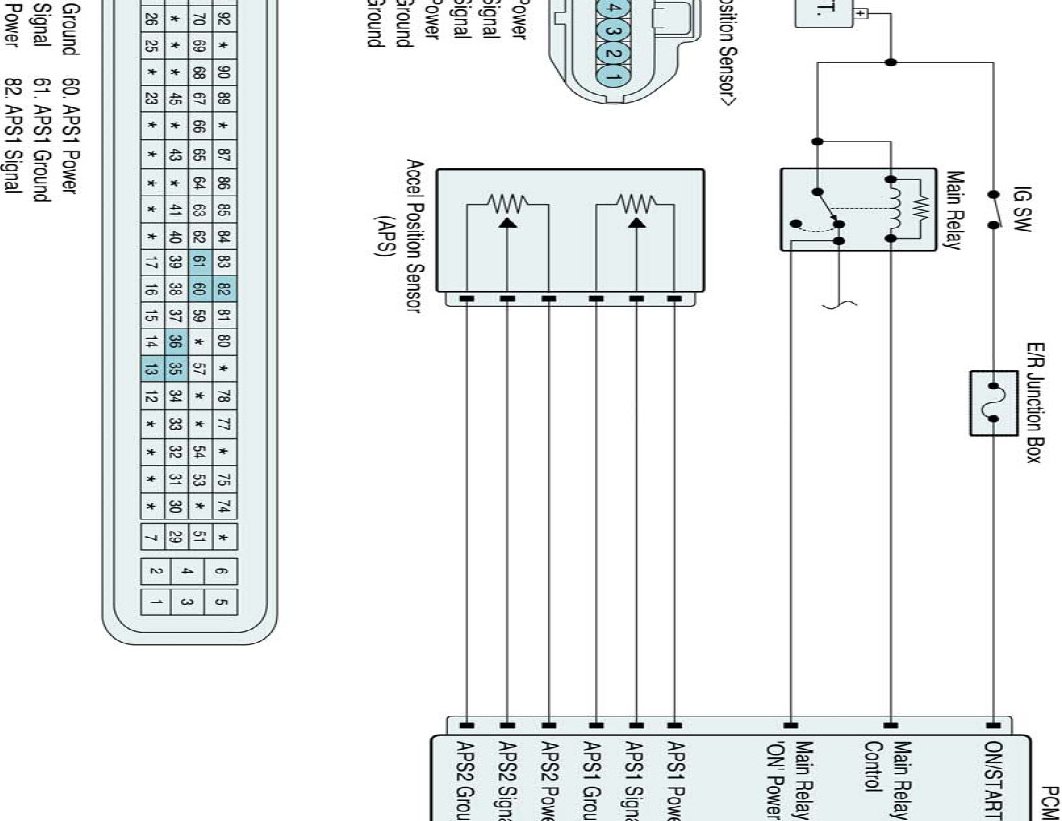 The Electronic Throttle Control (ETC) system is made of the components throttle body, Throttle Position Sensor (TPS) 1&2 and Accelerator Position Sensor (APS)1&2.The APS is mounted in the accelerator pedal to detect the opening angle of the accelerator pedal. It has 2 sensors to detect the accelerator position and a malfunction of the accelerator position sensor. The PCM judges the current opening angle of the accelerator pedal from APS 1&2, and the PCM controls the throttle motor based on these signals.