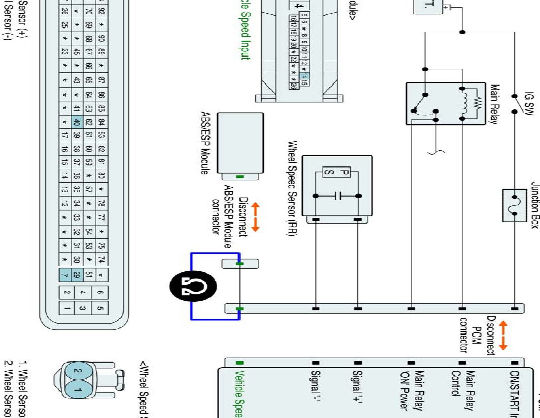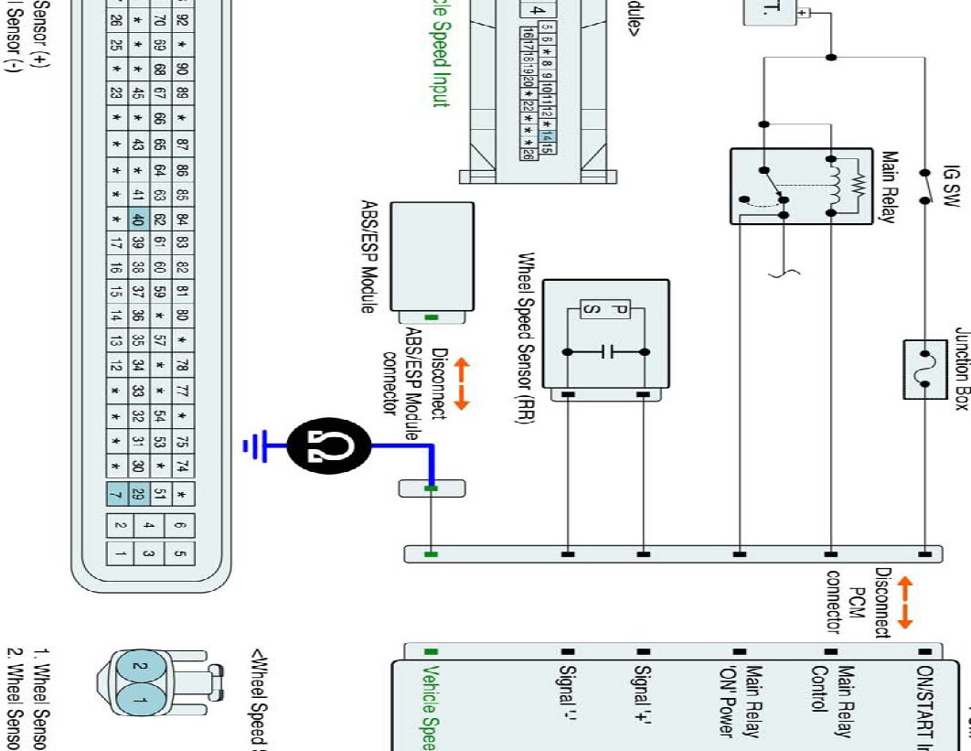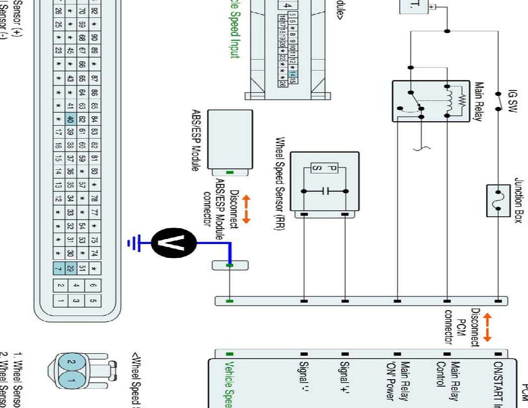 (2) Measure resistance between Vehicle speed input terminal of PCM harness connector and Vehicle speed output terminal of ABS/ESP Control Module harness connector.