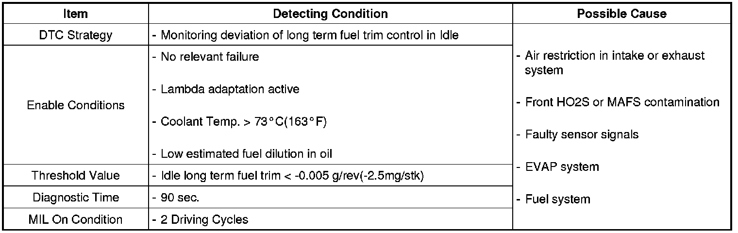 If the lambda controller reaches the maximum or minimum threshold, then feedback control is no longer possible and emissions will be increased. The PCM sets DTC P2188 if no proportional post catalyst fuel trim adaptation occurs for a defined time after the lambda controller has reached its minimum threshold at idle.