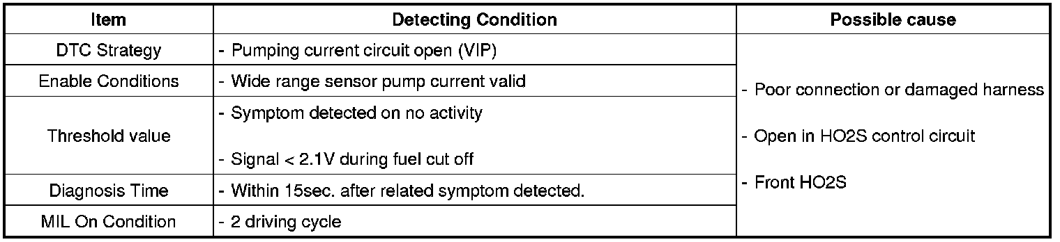 The PCM monitors front O2 sensor pumping current circuit (VIP) and sets DTC P2237 if front O2 sensor signal stuck is detected.