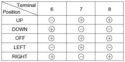 3. Apply battery voltage to each terminal as shown in the table and verify that the mirror operates properly.