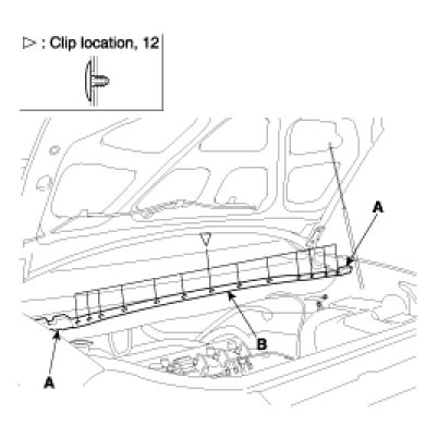 1. Detach the clips, then remove the hood weatherstrip(A).