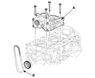 6. Remove the oil pump & balance shaft module (A) and balance shaft chain (B).