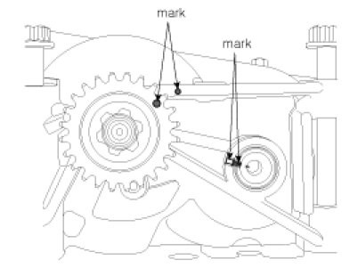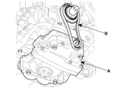 The balance shaft sprocket mark (A) should be matched with balance shaft housing timing mark (B) during installation.