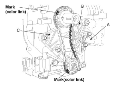 3. Install balance shaft module that the timing mark of balance shaft module sprocket should be matched with the timing mark (color link) of balance shaft chain.