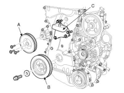 10. Remove the water pump pulley (A), crankshaft pulley (B) and engine support bracket (C).