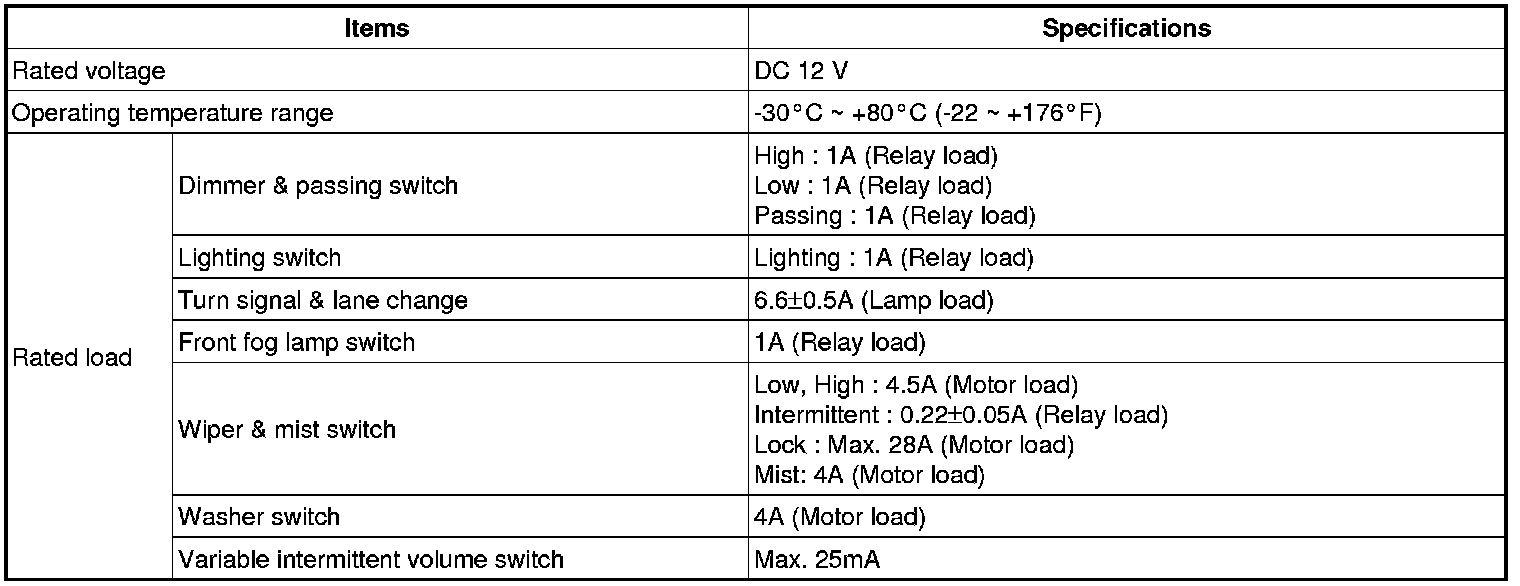 Combination Switch: Specifications