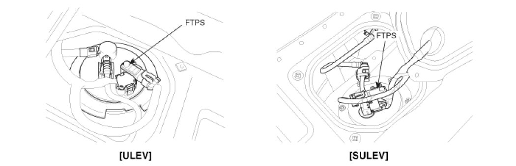 The evaporative emission control system prevents hydrocarbon vapors from escaping from the fuel tank into the atmosphere where they could form photochemical smog. Gasoline vapors are collected in the charcoal canister. The Fuel Tank Pressure Sensor (FTPS) is installed on fuel pump assembly and is an integral part of the evaporative monitoring system. The ECM monitors the FTPS signal to detect vacuum decay and excess vacuum. The FTPS measures the difference between the air pressure inside the fuel tank and atmospheric air pressure. The FTPS also checks the purge control solenoid valve operation and leak detection in the evaporative emission control system by monitoring pressure and vacuum levels in the fuel tank during the purge control solenoid valve operating cycles.