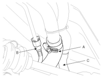 1. Disconnect the fuel filler hose (A), the leveling hose (B) and the vapor hose (C).