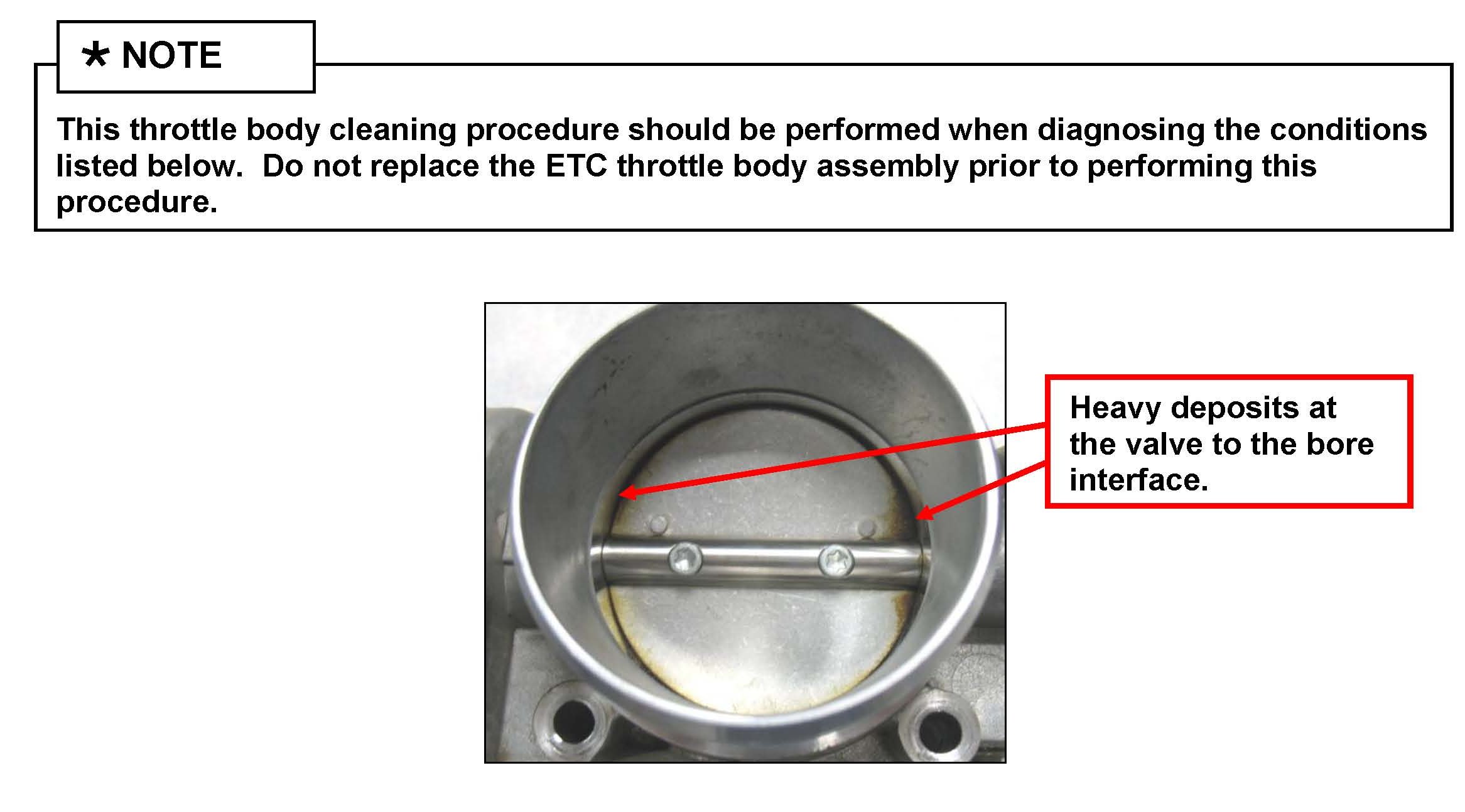 This bulletin provides the procedure to clean the Electronic Throttle Control (ETC) throttle body. If a vehicle exhibits the condition(s) listed below and deposits are found at the valve-to-bore interface inside the ETC throttle body, clean the throttle body using the procedure described in this bulletin.