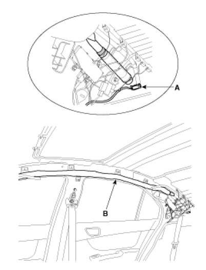 4. After loosening the mounting bolts, remove the curtain airbag (B).