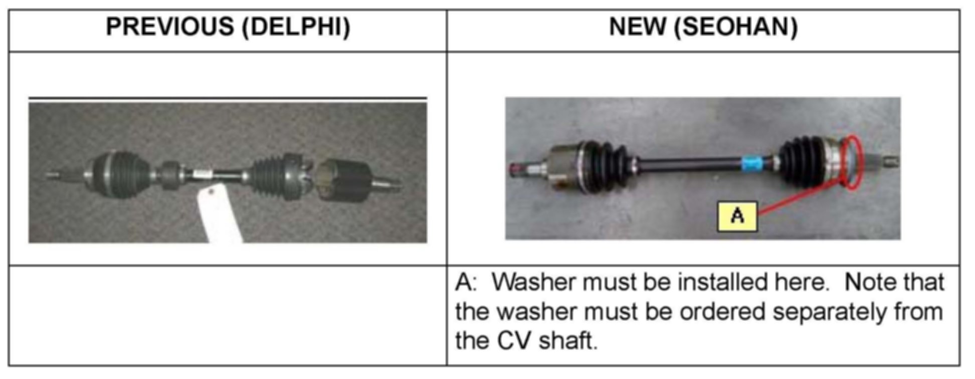When ordering the new CV shaft part number, it is also required to order a washer. See parts table.