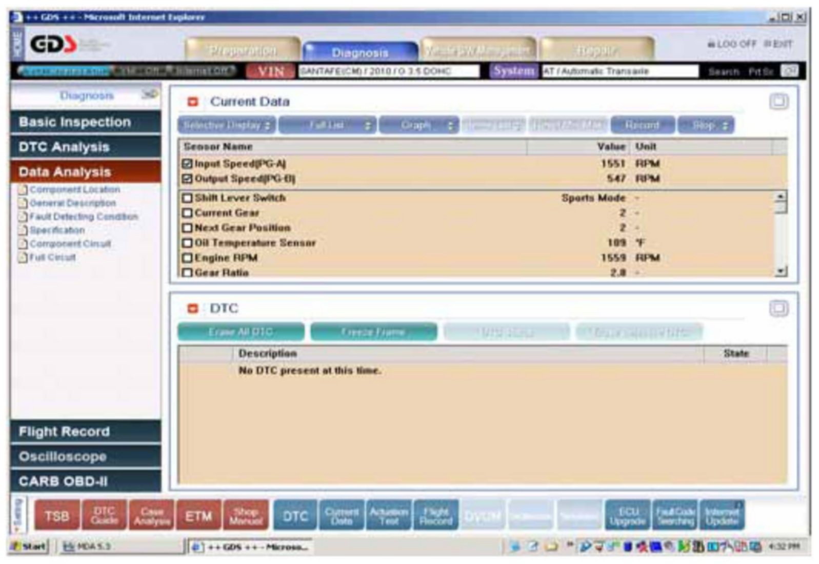 1. Using a GDS, check for DTC in "Automatic Transaxle" menu. Record the DTC and description.