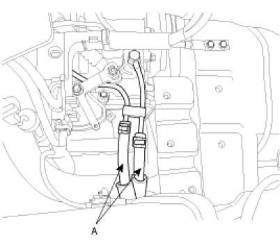6. Remove the transaxle oil cooler hoses (A) by releasing the clamps.