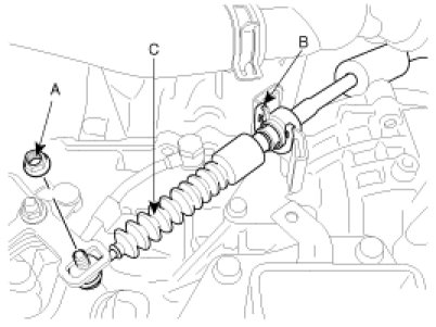 12. Remove the control cable assembly (C) by removing the nut (A) and one-touch clip (B).