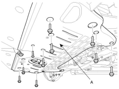 13. Remove the front wheels and lifting up the vehicle, remove the under cover (A).