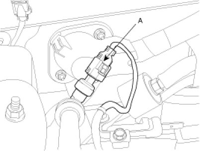 14. After connecting the power steering pressure tube (B) to the power steering oil pump, connect the power steering pressure sensor connector (A).