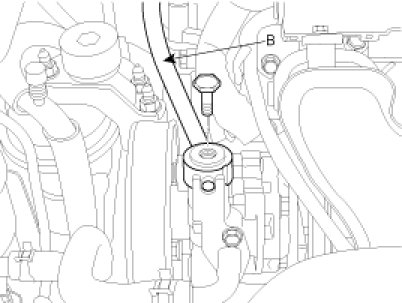 17. After disconnecting the power steering pressure sensor connector (A), disconnect the power steering pressure tube (B) from the power steering oil pump.
