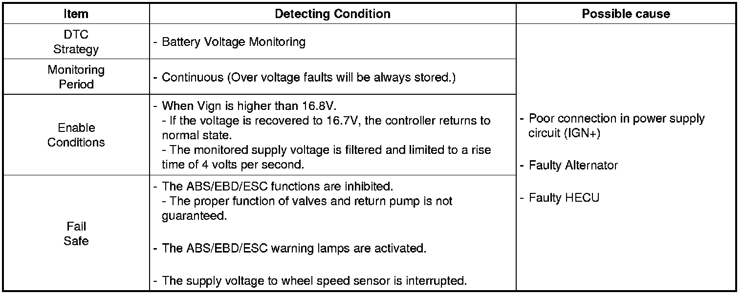 The ABS ECU monitors battery voltage by reading the value of voltage. When the voltage is higher than the expected normal value, this code is set, and the ABS/EBD/ESC functions are prohibited. If the voltage recovers, to within normal operating ranges, then the controller returns to normal operation as well.