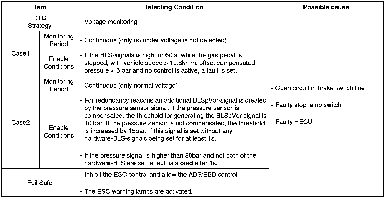 The brake light signal is a reference to judge driver's intention for braking and The HECU checks open or short circuit of stop lamp switch for normal ABS/ESC control. If the stop lamp switch have an error, warning ramp will be turned ON.