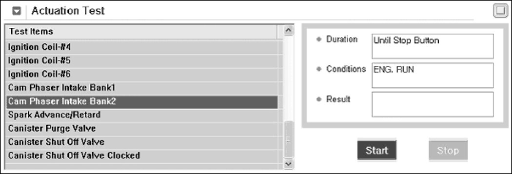 2. Select "CAM PHASER INTAKE BANK 2" on the Actuation Test