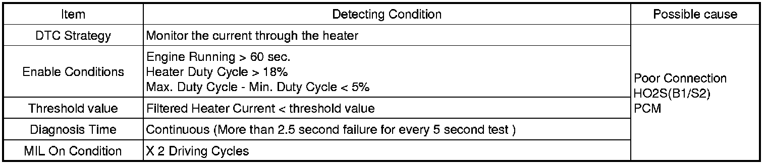 Checking current from HO2S under detecting condition,if the heater current is below a certain threshold for more than predeterminate time, PCM sets P0036. MIL (Malfunction Indication Lamp) turns on when the malfunction lasts till consecutive 2 driving cycle.