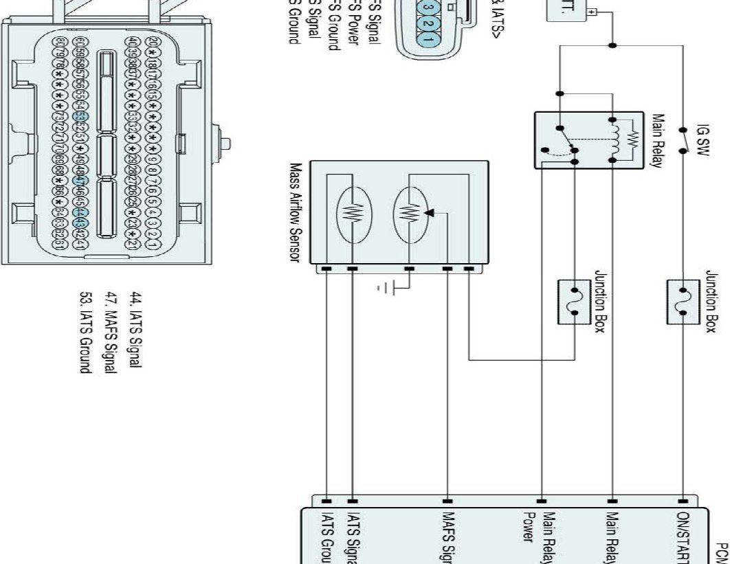 The Mass Air Flow Sensor (MAFS) is located between the air cleaner assembly and the throttle body. The MAFS uses a hot film type sensing element to measure the mass of intake air entering the engine. This hot film type air flow sensor consists of a hot film sensor, housing and metering ducts. Mass air flow rate is measured by detection of heat transfer from a hot film probe. The change in air flow rate causes change in the amount of heat being transferred from the hot film probe surface to the air. A large amount of intake air represents acceleration or high load conditions while a small amount of intake air represents deceleration or idle. The mass of intake air should increase at acceleration and be stable during constant engine speed. The PCM uses this information to determine the injection duration and ignition timing for the desired air/fuel ratio.