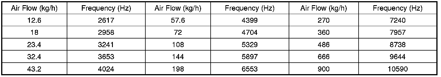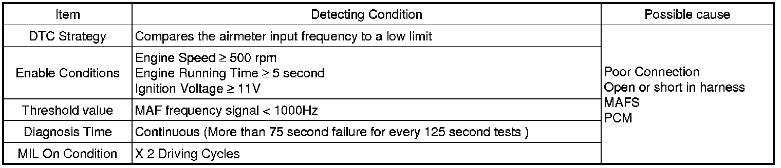 If PCM detects that frequency signal of MAFS is lower than1000 Hz for more than 75 second during one diagnostic test (125 second) while enable condition is me, PCM determines that a fault exists and a DTC is stored.