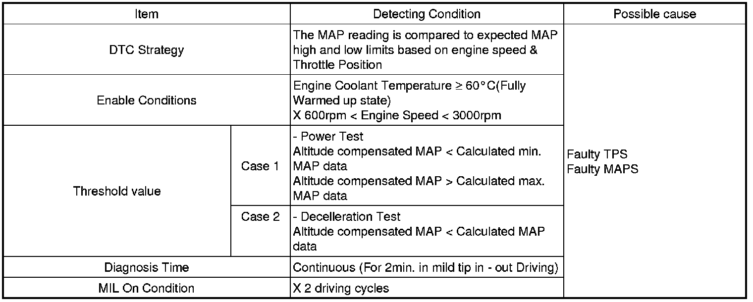 PCM compares the difference between MAPS output and calculated MAPS value while enable condition is met. If the actual MAP value or lower than calculated (threshold) value for 2 min failure during tip in-out driving, PCM determines that a fault exists and a DTC is stored.